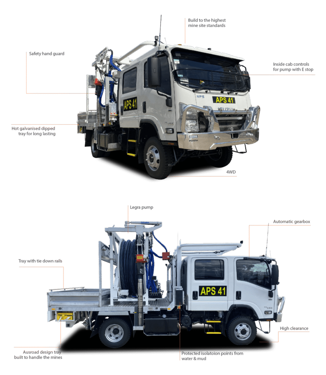 Built to the highest mine standards this truck allows the customer to pump water from blast holes giving them an opportunity to select more cost-effective blasting products to achieve the same outcome more cost effectively. The fully hydraulic pump with automatic controls inside the cab mean operators don’t have to leave the vehicle (and its air-conditioned comfort) to operate the unit. They simply drive to each hole that needs de-watering and operates fully hydraulic.